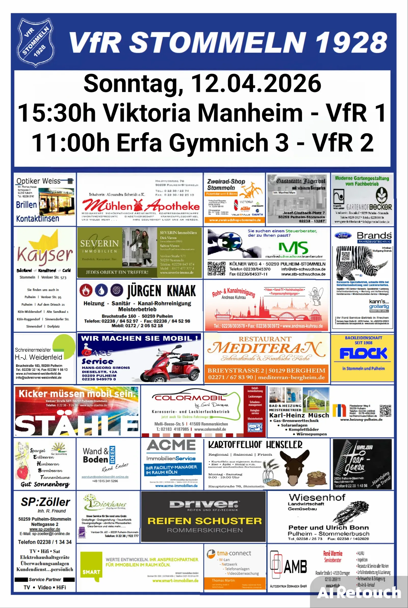Unsere Erste ist nach der Osterpause um 15:30 Uhr bei Viktoria Manheim zu Gast. Nach der Niederlage gegen den FC Bergheim 2000 vor zwei Wochen, wollen unsere Jungs dem Tabellenzweiten aus Manheim die Stirn bieten und ihr wahres Gesicht zeigen und wieder punkten. Wir freuen uns auf ein packendes Spiel.